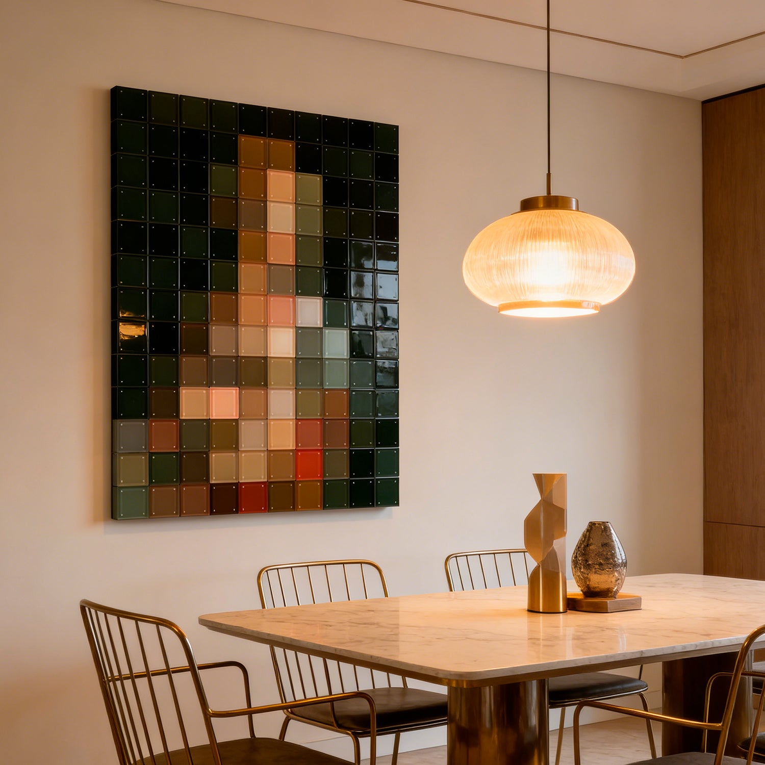About: Created by the thoughts of Van Gogh and mosaic, inspiring colors for lightning up the room. Material: Acrylic pieces puzzled together to form the appearance of the artist. Suggested Area: Tranquil colors for the living room or hallway to bring some creative feeling.